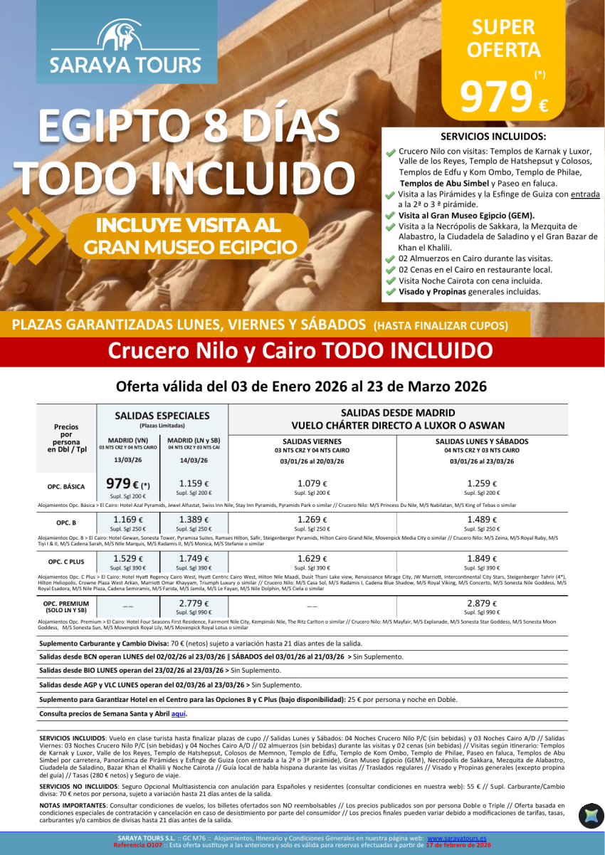 Egipto Todo Incluido 8d. *Salidas Mad,Bcn,Bio,Agp,Vlc* Crucero y Cairo+ visitas, Propinas y Visado. Desde 929€