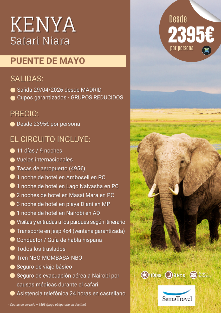 Kenya Puente de Mayo "Safari Niara+Playa": 11 días con visitas y playa Diani, Nairobi (29ABR) *Desde 2.395€*